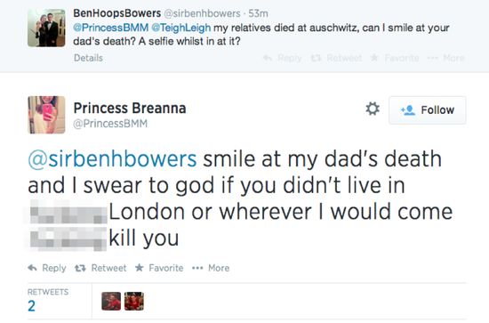 私の親族はアウシュヴィッツで亡くなったんですけど・・私があなたの父親の死に対して笑顔を作っても良いとお考えですか?しかも自撮りしながら。
