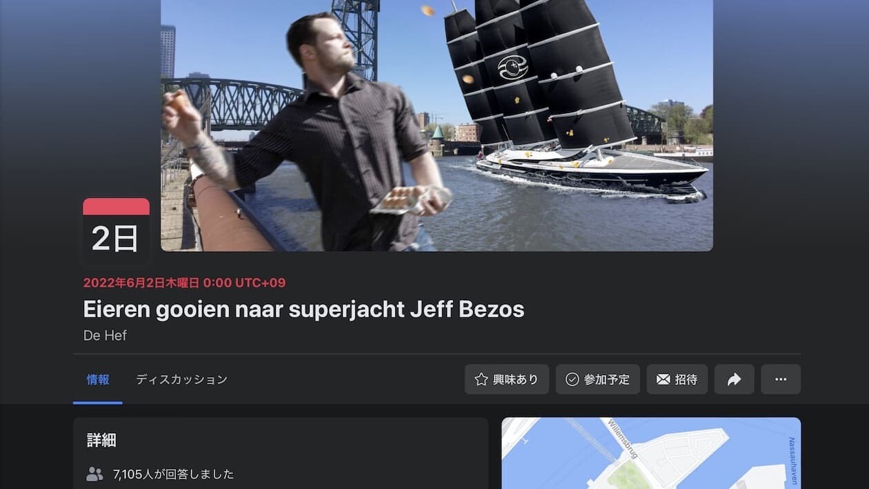 これに怒ったロッテルダム市民らは「腐った卵をベゾス氏のスーパーヨットに投げつける」イベントを企画。Facebookでは現在7000人以上が参加に興味を示している。